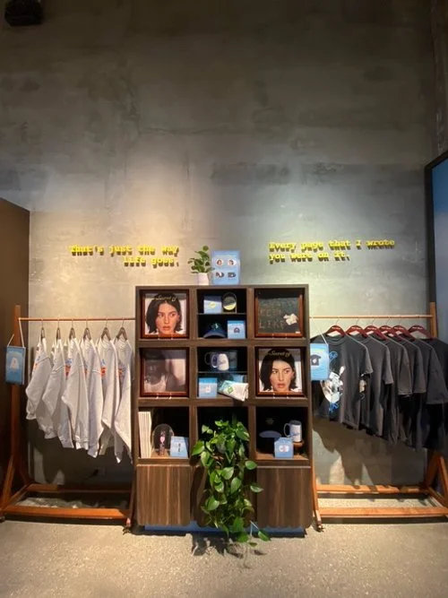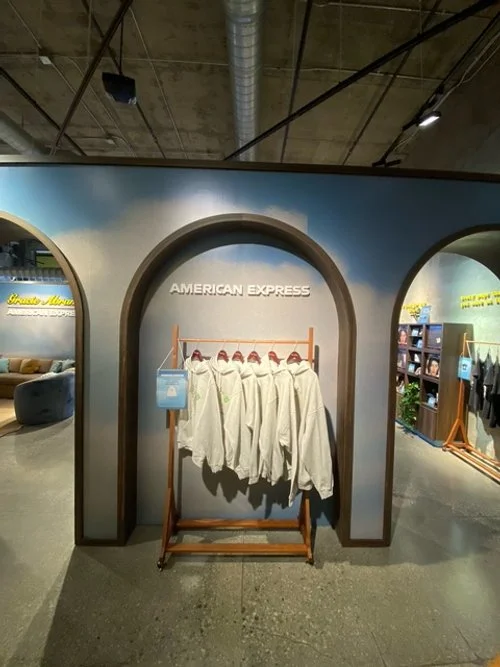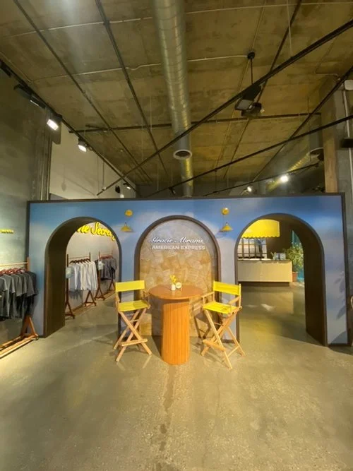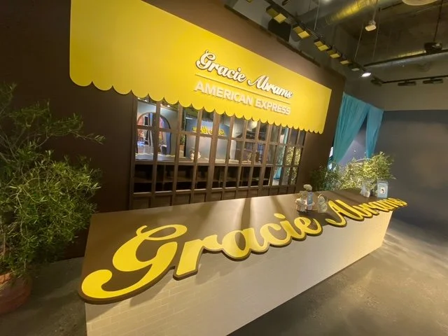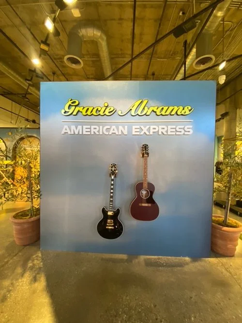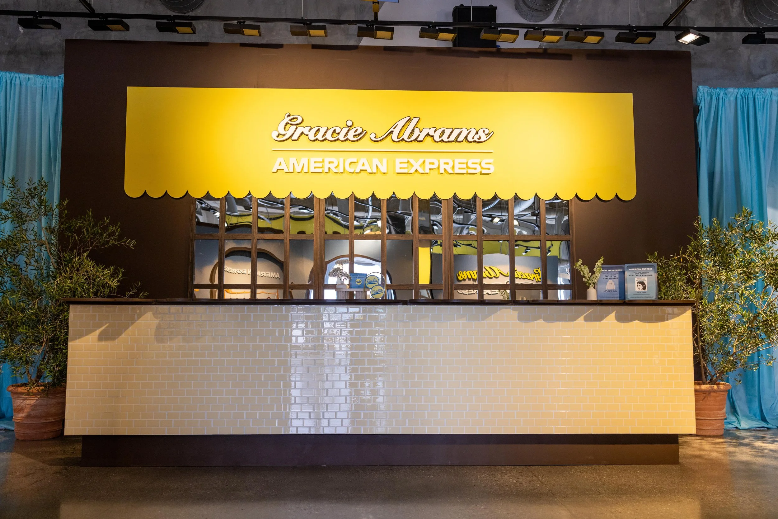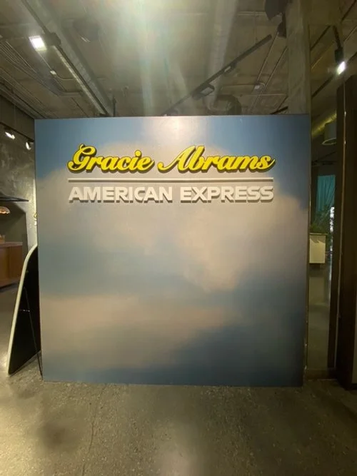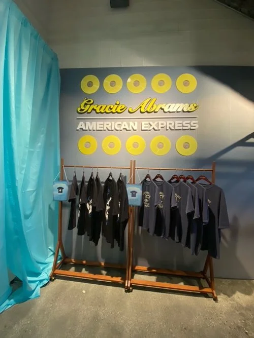 While Gracie Abrams lit up the stage at the Kia Forum, Slaack Productions brought the experience to Melrose with a pop-up shop in partnership with American Express—giving die-hard fans an exclusive shot at her merch. Our team built a custom 14-foot countertop with Gracie’s name CNC-cut into the surface, exterior awnings for curb appeal, and a series of double-sided graphic walls that shaped and divided the space. The buildout also featured a matcha bar pergola, custom arches, and a one-of-a-kind cabinet designed to showcase albums and CDs.