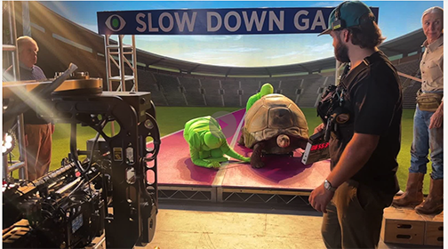 The second set transported us to a stadium track, where the star was a massive tortoise puppet requiring three operators to bring it to life. To sell the perspective, every element—from track lanes to stadium seating—was fabricated with precise alignment to the locked camera angle. Once the vanishing point and horizon line were established, the builds became a meticulous exercise in geometry and craftsmanship, ensuring the illusion held perfectly in frame.